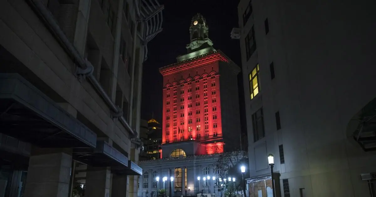 Oakland City Hall is bathed in red light in a memorial to the people who have died from COVID-19 throughout the country in Oakland, Calif. in Janua...